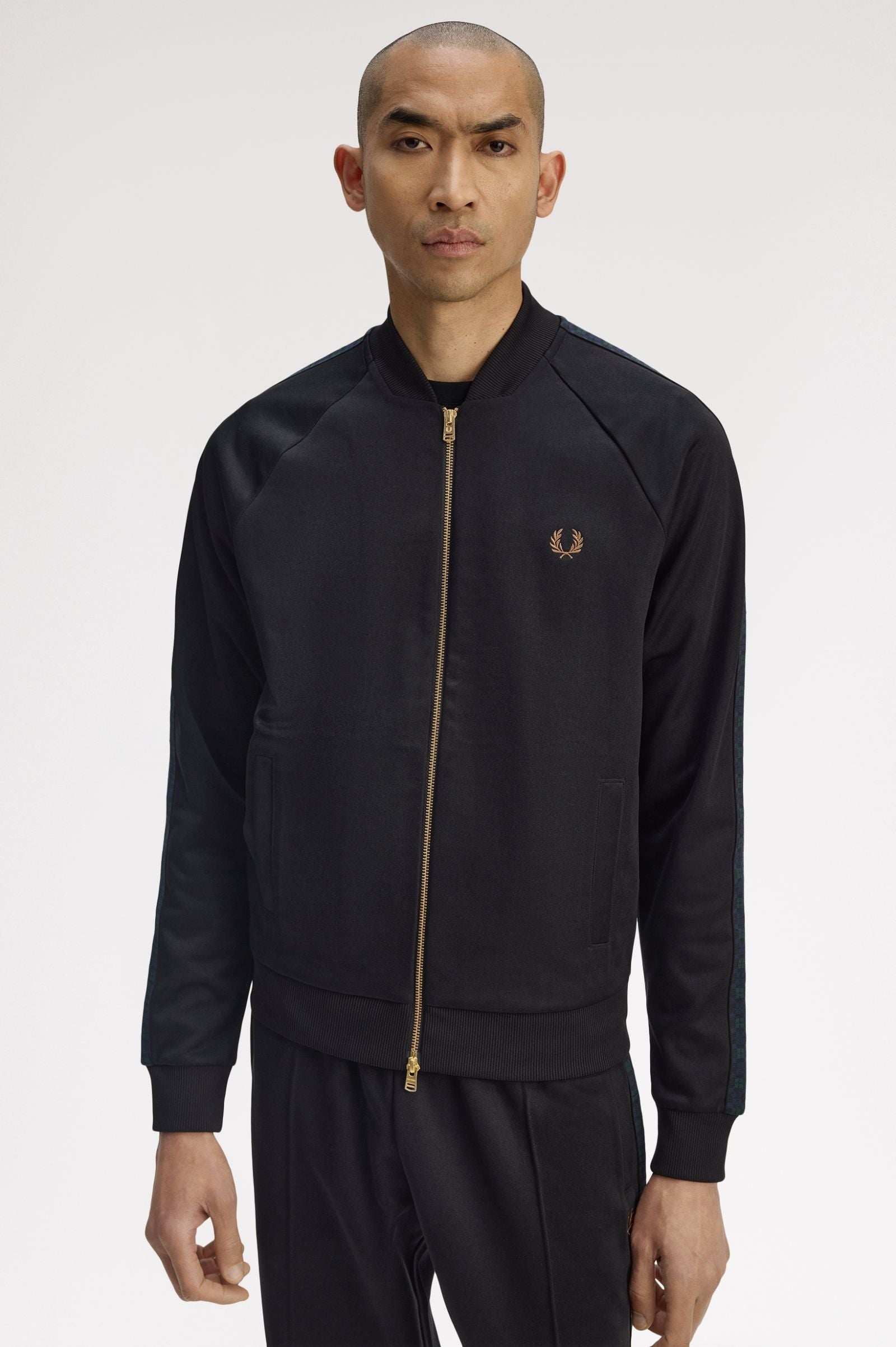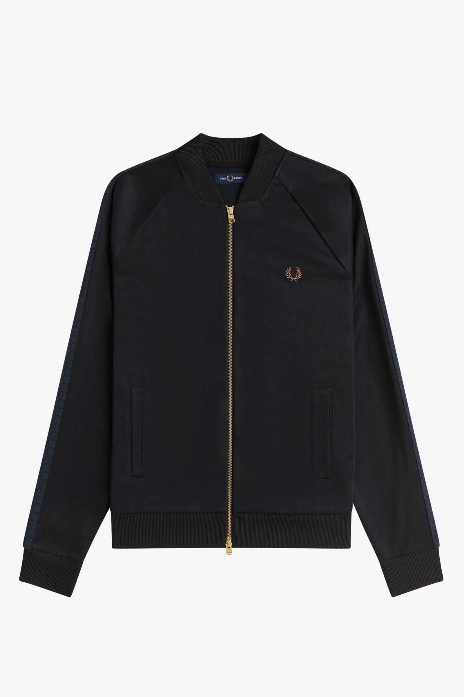 Originally bound with sports tape to display team colours, the track jacket started as a sporting essential and became a canvas for self-expression. This time our signature sports taping takes the form of knitted Black Watch tartan, a relatibe of royal tartan that takes its name from the Scottish Black Watch regiment. But it’s also an ‘open tartan’ – meaning anyone can wear it. A mark of inclusivity and self-expression, just like the Laurel Wreath. Finished with a gold-tone two-way zip, welt pockets, and a sporting raglan sleeve for full range of movement.