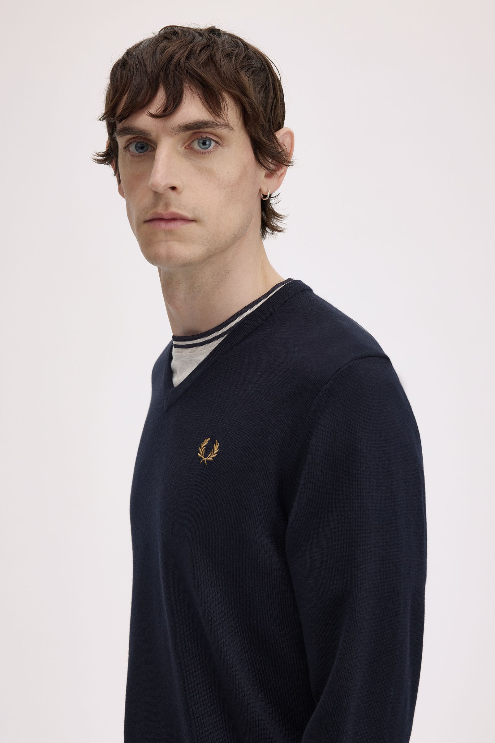 A V-neck jumper with a merino wool blend and our signature twin twipping at the neck.