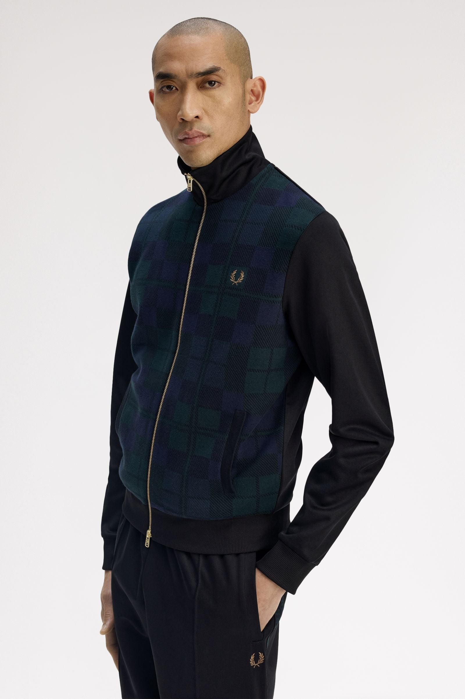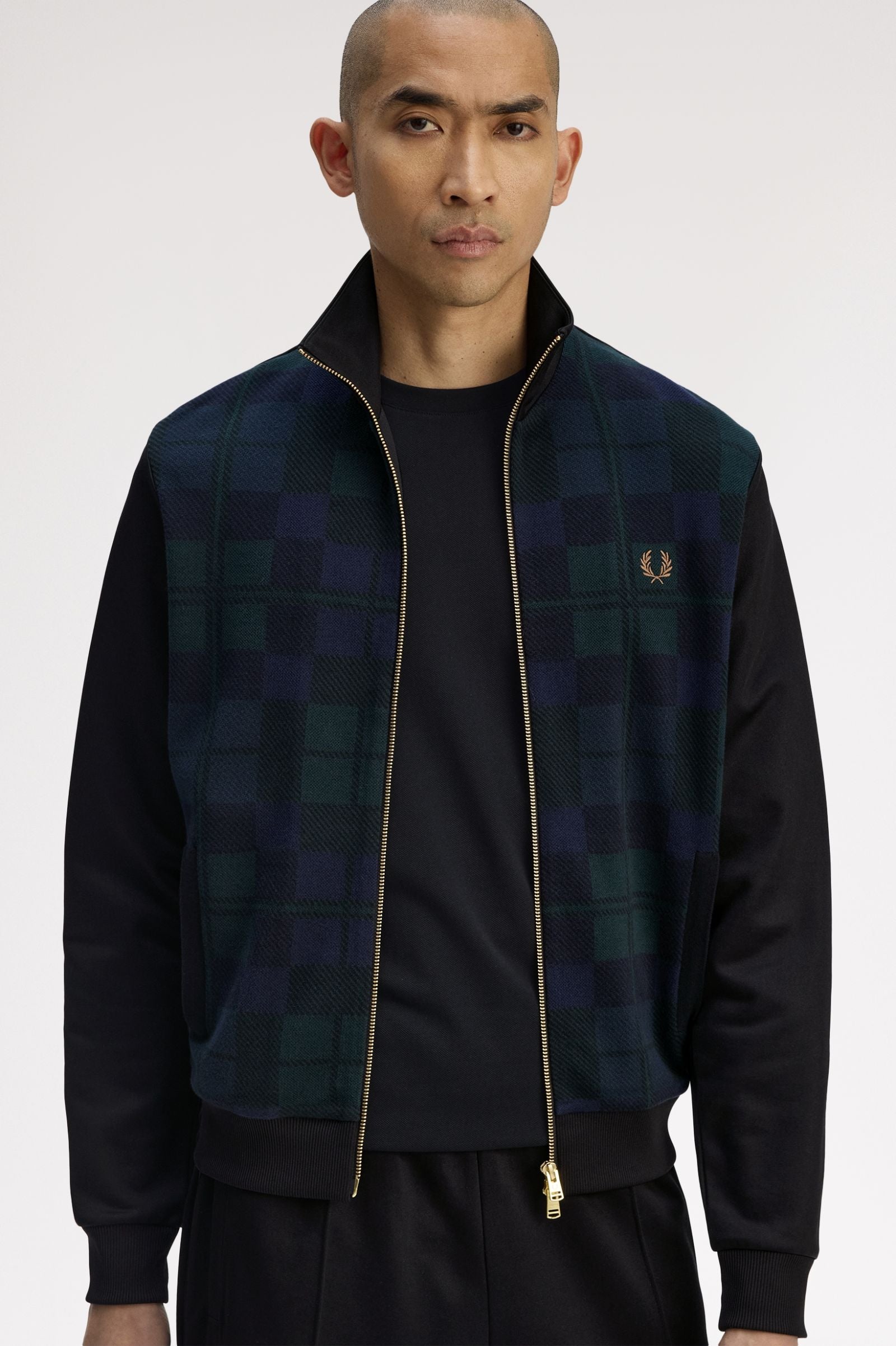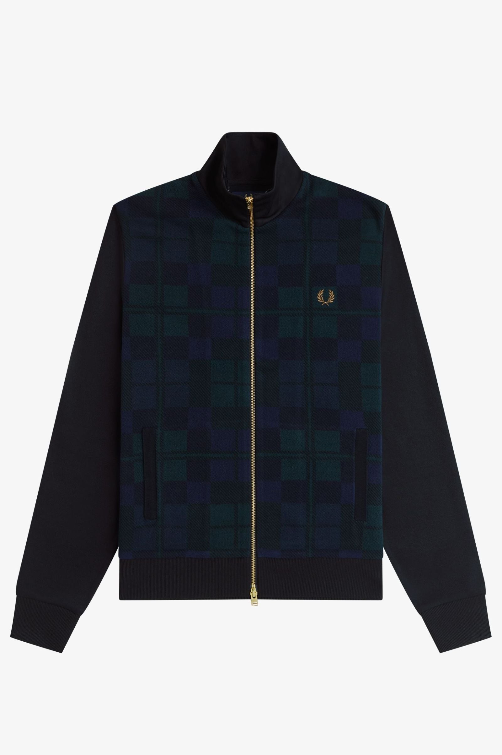 We rework our classic tricot track jacket with a combed cotton panel in Black Watch tartan – a relative of royal tartan that takes its name from the Scottish Black Watch regiment. But it’s also an ‘open tartan’ – meaning anyone can wear it. A mark of inclusivity and self-expression, just like the Laurel Wreath. Finished with a gold-tone two-way zip, welt pockets, and a funnel collar for a sharp look.